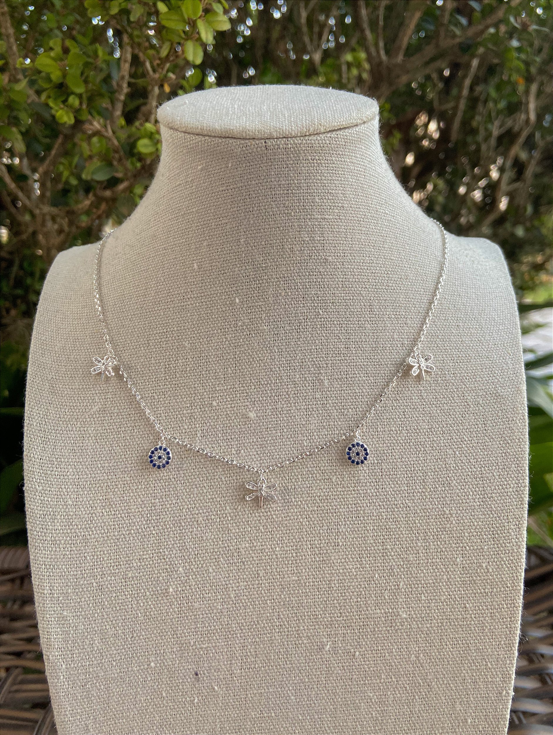 COLAR PRATA OLHO GREGO CRAVEJADO LIBELULA CRAVEJADA PRATA 925